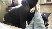 Квартирант отрабатывает долг за квартиру, вылизывая ножки хозяйки, пока та общается с мужем по телефону